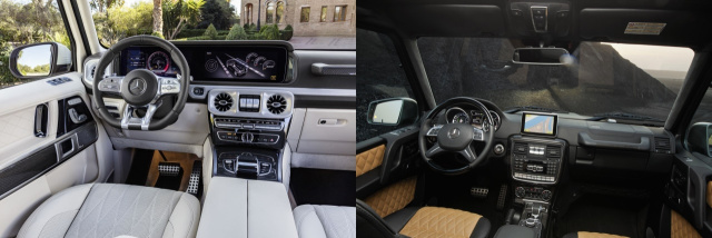 Der neue G 63 erhielt ein grundlegend neu gestaltetes, modernes Interieur, das gezielt Elemente des Exterieurs aufgreift. So spiegeln sich die Form der Rundscheinwerfer in den seitlichen Belüftungsdüsen und die Gestaltung der Blinker in den Hochtönern auf der Instrumententafel wider. Typisch für den G 63 sind auch der Haltegriff vor dem Beifahrer oder die in Chrom hervorgehobenen, zentral platzierten Schalter für die drei Differenzialsperren.
