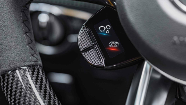 Mit den beiden frei belegbaren Displaytasten und den Zusatzschaltern lassen sich weitere AMG Funktionen griffgünstig direkt am Lenkrad bedienen. So kann sich der Fahrer uneingeschränkt dem dynamischen Fahren widmen, ohne die Hände vom Lenkrad nehmen zu müssen. Über ein Icon auf dem weiteren TFT-Display wird die jeweilige gewünschte Funktion dargestellt, mit dem dazugehörigen Tippschalter stellt der Fahrer die jeweilige Funktion ein. Somit können die beiden individuell bevorzugten AMG Funktionen definiert und die Einstellungen mit nur einem Fingertipp geändert werden.