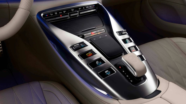 Inspiriert vom zweitürigen Mercedes-AMG GT stellt die Mittelkonsole des neuen 4-Türers eine weitere Besonderheit dar. Neu und einzigartig sind die in den markanten und maßgeschneiderten Zierrahmen integrierten, farbigen Displaytasten für die integrierte Anzeige und Steuerung von Getriebelogik, Fahrwerk, ESP®, Abgasanlage, Start-Stopp-Funktion und Heckflügel. Die in TFT-Technologie ausgeführten Displaytasten zeigen über farbige, intuitiv verständliche Symbole deren Funktion an und lassen sich mit einem kleinen Fingertipp entsprechend einfach bedienen. Eine weitere Neuheit bei AMG sind die kapazitiven Schalter direkt vor dem stilisierten V der Mittelkonsole. Über diese Näherungsschalter lassen sich Rückfahrkamera, Navigation, Radio, Media, Telefon und Fahrzeugeinstellungen bedienen. Nähert sich der Finger der Schaltfläche mit minimalem Abstand, leuchtet das entsprechende Symbol direkt in der Headunit auf und wählt den Menüpunkt vor. Durch Drücken wird die entsprechende Funktion letztendlich aktiviert. Der Fahrer muss den Blick nicht abwenden, denn der entsprechende Menüpunkt wird gleichzeitig im Multifunktionsdisplay des Widescreen-Cockpits angezeigt, was für ein Plus an Fahrsicherheit sorgt.