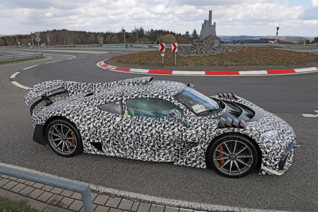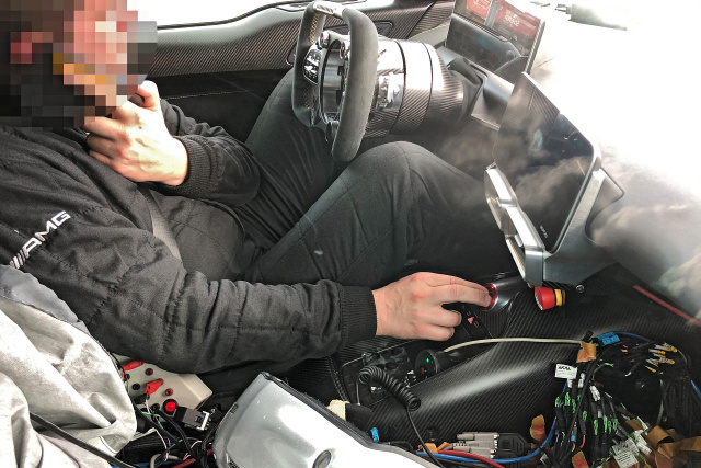 Einer der beiden Mercedes-AMG One Hypercar Prototypen hier am Nürburgring ist heute Nachmittag vor der Einfahrt zur Nordschleife mit einem technischen Defekt liegen geblieben. Das Auto rollte genau am "Fotografen-Hotspot“ vor der Einfahrt zur Nordschleife aus und stand dort für mehrere Minuten. Erst als Hilfe aus dem ca. 2 km entfernten Testcenter von AMG vor Ort war, konnte das Fahrzeug wieder im Elektro-Modus langsam zurück in die Werkstatt gebracht werden. Der Mercedes-Fans.de Erlkönigjäger hat die Situation genutzt und den Mercedes-AMG ONE mit Details und Innenraum fotografiert.