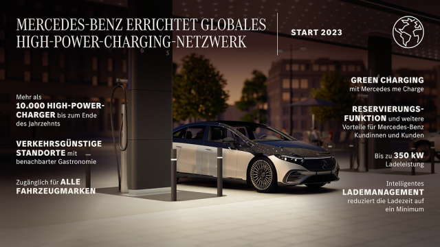 Tesla hat es mit den Superchargern vorgemacht. Nun wartet auch Mercedes nicht länger darauf, dass Energieversorger und öffentlich Hand für Hochleistungsladestationen mit niveauvollem Umfeld/Service sorgen. Mercedes-Benz kündigt weitreichende Pläne für den Aufbau eines globalen High-Power-Charging-Netzwerks an. Es werde auch Fahrern anderer Marken zur Verfügung stehen. Der Aufbau einer Hochleistungsladeinfrastruktur mit weltweit rund 10.000 Ladesäulen, verteilt auf 2.000 Ladeparks, werde, so deutete Mercedes-Che3f Ola Källenius auf einer Pressekonferenz an, um die zwei Milliarden Euro kosten. Noch in diesem Jahr will der Stern mit der Errichtung eines eigenen High‑Power-Charging-Netzwerks in Nordamerika starten. Je nach Region und Standort sollen die Ladestationen vier bis zwölf und maximal bis zu 30 High-Power-Chargers mit bis zu 350 kW Ladeleistung bieten. Ein intelligentes Lademanagement soll dafür sorgen, die E-Autos mit ihrer maximalen Kapazität zu laden und so die Wartezeiten beim Strom-Tanken zu minimieren. Die Architektur der im Idealfall wettergeschützt überdachten Ladestationen soll nach Möglichkeit viel Platz rund um das Automobil bieten und so ein ungehindertes Laden von beiden Seiten möglich machen. Um den Kunden ein bestmögliche Laderlebnis anbieten zu können, sollen nah der Ladeparks gastronomische Einrichtungen und Sanitärräume zu finden sein. Ferner werden die Stationen mit Überwachungskameras ausgestattet.