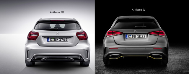 Das Heck der vierten A-Klasse Generation wirkt breiter. Die Rückstrahler sind in den modular aufgebauten zweiteiligen Heckstoßfänger ausgelagert. Die zweigeteilten, schmalen Rückleuchten betonen den etwas emotionaleren Auftritt des W176-Nachfolgers. Infolge der der nun zweigeteilten Rückleuchten fällt die Ladeöffnung 20 cm breiter aus als bislang.