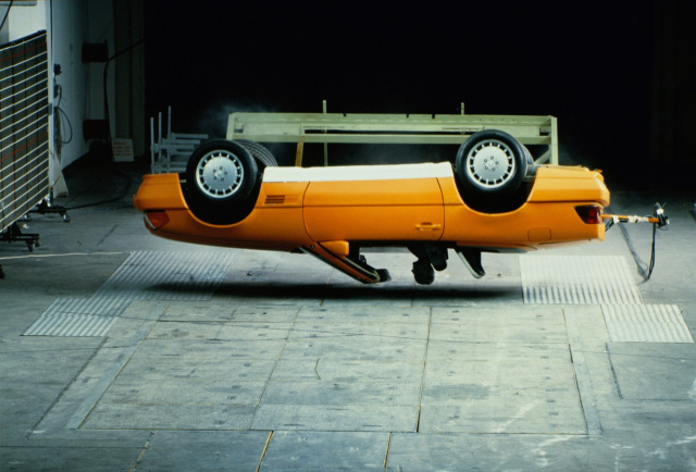 "Beim Dachfalltest fällt die Karosserie in leichter Schräglage aus 50 Zentimeter Höhe auf die Dachstruktur und das Fahrzeug prallt auf eine der beiden A-Säulen. Unsere Unfallforschung hat gezeigt, dass diese Fallhöhe sehr gut mit der Fallhöhe bei realen Überschlägen korreliert. Schon Ende der 1950er-Jahre hat unser Unternehmen mit dynamischen Überschlagtests begonnen, bei denen Fahrzeuge einseitig über eine Rampe gefahren werden. Diese führen wir noch heute durch. Das sieht spektakulär aus, hat aber den Nachteil, dass der Aufprall eher zufällig erfolgt und die Ergebnisse daher kaum reproduzierbar sind."