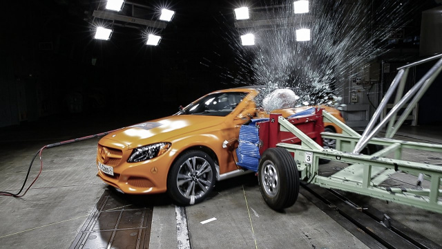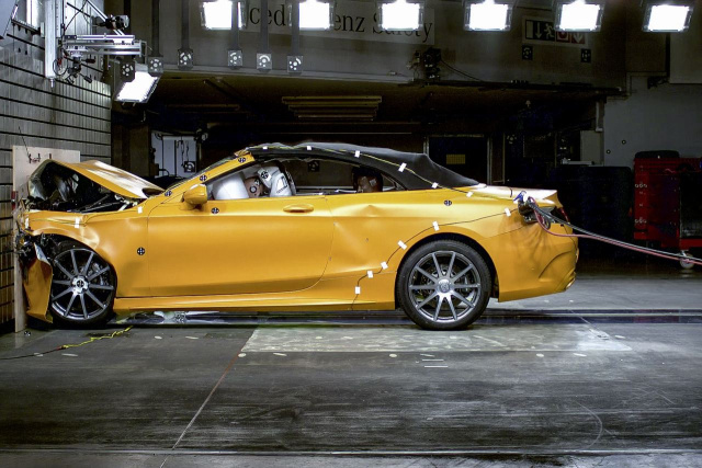 "Selbstverständlich. Alle Fahrzeuge von Mercedes-Benz Cars absolvieren das gleiche harte Entwicklungsprogramm. Das gilt für den smart fortwo ebenso wie für die S-Klasse und für Cabrios ebenso wie für Limousinen oder SUV. Insgesamt 40 unterschiedliche Crashtest-Konfigurationen müssen alle Fahrzeuge bestehen. Darunter sind neben den gesetzlich vorgeschriebenen Crashtests und Ratings auch zusätzliche interne Crashtests mit oft weit strengeren Anforderungen – wie etwa der Dachfalltest."