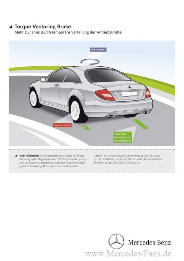 Für zusätzliche Sicherheit und Agilität im Grenzbereich sorgt in der neuen Generation der CL-Klasse die serienmäßige Torque Vectoring Brake ein gezielter einseitiger Bremseingriff am kurveninneren Hinterrad. Hierdurch lenkt das Luxus-Coupé bei dynamischen Kurvenfahrten noch agiler ein.