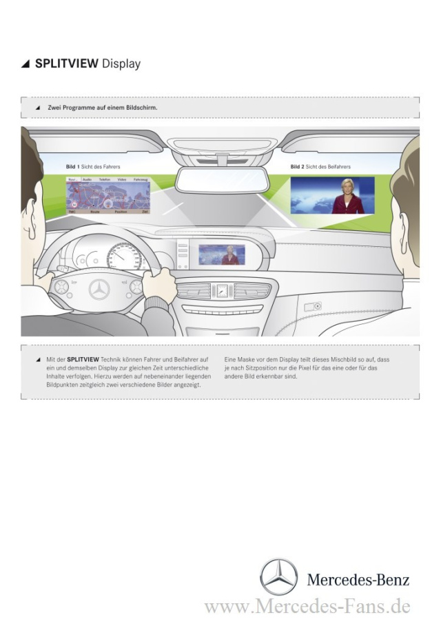 Dem souveränen Charakter und dem Anspruch als technisches Meisterstück entsprechend, setzt die CL-Klasse auch beim On-Board-Infotainment Maßstäbe. So stattet der Stuttgarter Automobilhersteller die zentral in der Mittelkonsole untergebrachten Bedien- und Anzeigesysteme COMAND und COMAND APS auf Wunsch mit der neuen SPLITVIEW-Technik aus (Serie beim CL 600 in Verbindung mit dem Entertainment-Paket vorne). Das innovative Display-Konzept ermöglicht es Fahrer und Beifahrer, auf ein und demselben Bildschirm zur gleichen Zeit unterschiedliche Inhalte zu verfolgen. Während beispielsweise der Fahrer die Kartennavigation nutzt, kann der Beifahrer einen Spielfilm auf DVD ansehen.