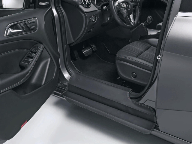 Der Einstiegsschutz mit Doppelfunktion: Zum einen schützt er die Einstiegsleiste vor Beschädigungen und Kratzern, zum anderen sorgt er wirksam dafür, dass beim Ein- und Aussteigen die Kleidung des Fahrers nicht verschmutzt wird. Durch ein ausgeklügeltes Faltkonzept kann der Einstiegsschutz im Fußraum neben dem Schweller abgelegt werden und ist damit perfekt aufgeräumt. (Bilder: Daimler)