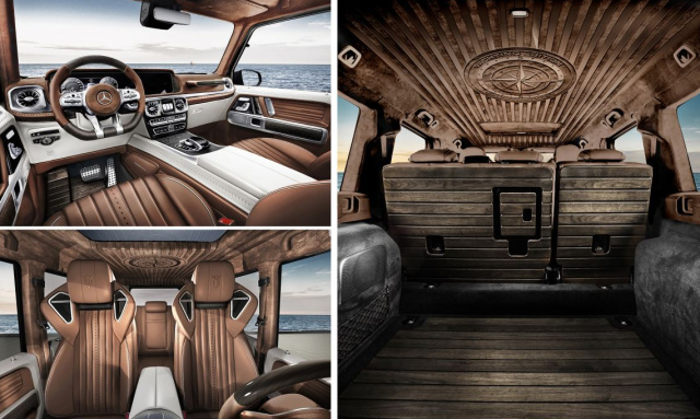 Der Dachhimmel wurde mit einer Windrose verziert. Das mit hochwertigem Leder verzierte Lenkrad ist mit Holzbezügen versehen. Last but not least gibt es einen Boden aus hölzernen Planken, die in jeder Beziehung perfekt zum Thema und zur exklusiven Gestaltung des G YACHTING passen. Keine Frage, wer mit dieser individuell ggestalteten G-Klasse am Hafen oder wo auch immer aufkreuzt, der macht perfekt die Welle und ihm ist die Woge der Begeisterung des autofeinsinnigen Betrachters gewiss.