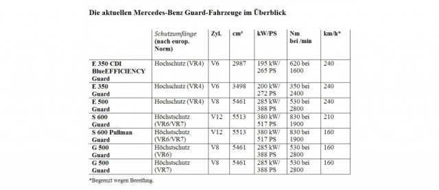 Höchstschutz-Automobile der Widerstandsklasse VR6/VR7 setzen der Bedrohung durch Terroranschläge eine wirkungsvolle Abwehr entgegen. Ihre Armierung ist gegen Gewehrprojektile aus militärischen Waffen konzipiert, die fast doppelt so schnell fliegen wie Revolvergeschosse. Außerdem leisten sie Widerstand gegen Handgranaten-Splitter und Sprengsätzen. Sieben Guard-Modelle bietet Mercedes-Benz ab Werk an.
