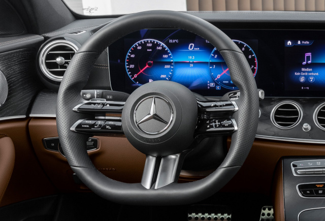 Mit der Modellpflege erhält die E-Klasse ein völlig neu gestaltetes Lenkrad. Erhältlich ist es in drei Versionen: als reines Lederlenkrad, in der Kombination Holz-Leder und in einer Supersport-Ausführung. Die Bedienflächen sind in Schwarz Hochglanz und die Zierelemente und Randeinfassungen in Silver Shadow gehalten. Die Steuerung der Bedienfunktionen von Kombiinstrument und Media-Display erfolgt durch Entlangstreichen über die Touch-Controls. Das für die Touch-Control-Buttons verwendete physikalische Prinzip wechselt von optisch auf kapazitiv. Auf Mechanik konnte verzichtet werden, zudem sind diese Touchflächen weniger anfällig für Fingerabdrücke. Die Erkennung, ob der Fahrer das Lenkrad unter Kontrolle hat, erfolgt jetzt durch eine kapazitive Erkennung (siehe Abschnitt zu den Fahrassistenzsystemen).