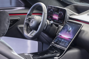 Wie bisher kann man die Instrumenteneinheit aus verschiedenen Themen auswählen. Neu ist ein besonders tiefer 3D-Effekt in dem Display hinter einem der zwei Dreispeichen-Lenkräder. Im Vergleich zum Vorgänger wurde das Cockpit deutlich entschlackt. Nach Mercedes-Informationen gibt es 27 Taster Schalter und Bedienelemente weniger als beim Vorgänger – bei einer deutlichen Erweiterung der Bedienfunktionen. Neu ist eine Schalterleiste unter dem zentralen Touchscreen mit Direktzugriffen auf die wichtigsten Funktionen wie Fahrprogramm, Warnblinkanlage, Kameras oder laut/leise. Den Fingerabdruckscanner gab es schon einmal bei der vorletzten Generation des Audi A8. Er soll jedoch nicht nur aus Erkennungsmerkmal, sondern später auch für Bezahlfunktionen im Auto als letzte Bestätigung genutzt werden können. Der Zugriff auf gespeicherte Individualisierungen läuft neben dem Fingerandruckscanner auch über eine kleine Kamera in der Instrumenteneinheit sowie die Sprache.