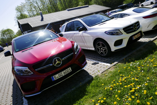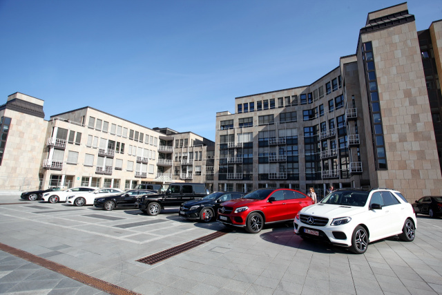 Schon am Flughafen wurden wir stilecht von den Daimler-Mitarbeitern Nadine und Tobias im G 63 AMG abgeholt und in die Zentrale gebracht. Und da standen die Hauptdarsteller auch schon mitten auf der Piazza: 15 der atemberaubendsten Fahrzeuge, die die Mercedes-Modellpallette zu bieten hat. Vom GLA 45 AMG über diverse CLS, SL und S-Coupés bis hin zum G-Modell oder dem AMG GT S war alles dabei. Stargäste waren der brandneue GLE und sein noch exklusiverer Bruder, das GLE Coupé. Und fast alle trugen die drei magischen Buchstaben am Heck: AMG!
