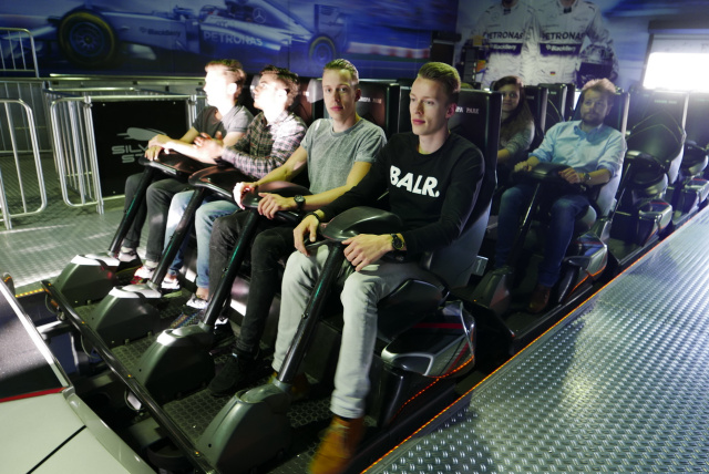 Nachdem alle ihre Zimmer im feudalen Hotel El Andaluz bezogen hatten, traf man sich zunächst im Basiscamp, einem Eventsaal im französischen Dorf. Danach gab es eine kleine Überraschung in Form einer Fahrt im Silver-Star, einer der schnellsten und höchsten Achterbahnen Europas. Das lag insofern nahe, weil Mercedes-Benz einer der Hauptsponsoren dieser Attraktion ist, deren Station sich direkt auf der Mercedes-Benz-Motorhall befindet.