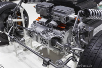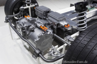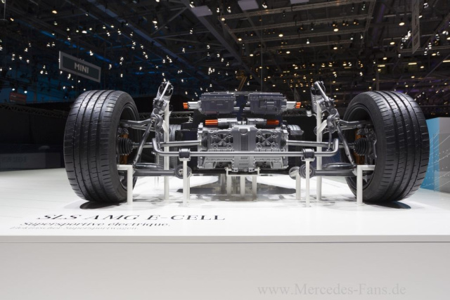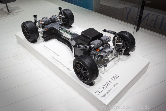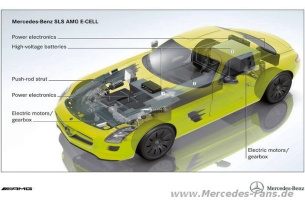 Mit dem Elektrik-Antriebsstrang des SLS AMG E-CELL gibt die Mercedes-AMG GmbH einen weiteren Einblick in ihr aktuelles Entwicklungsprojekt. Der Antriebsstrang wird seit 2010 als Ergebnis der Kooperation von Mercedes-AMG und Mercedes AMG High Performance Powertrains in Brixworth gemeinsam entwickelt. Vier radnah angeordnete Synchron-Elektromotoren mit 392 kW Höchstleistung und einem Drehmoment von 880 Newtonmetern sorgen im SLS AMG E-CELL für faszinierende Fahrdynamik. Als Monocoque-Gehäuse für die Hochvoltbatterie dient ein Carbon-Mitteltunnel, der konstruktiv in die Aluminium-Rohkarosserie integriert und fest mit ihr verklebt ist. Die leichten Faserverbundstoffe haben ihren Ursprung unter anderem in der Formel 1.