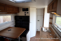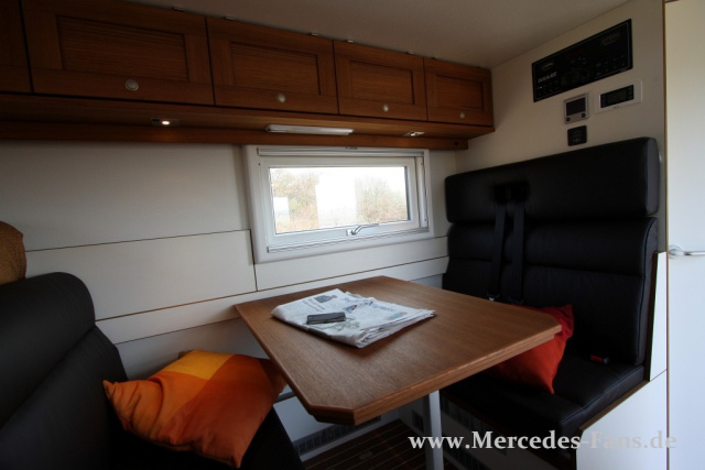 Auf der Fahrerseite ist mittig die Essnische angeordnet, sie bietet fünf Personen reichlich Platz für eine gemütliche Runde. Insgesamt ist das Fahrzeug mit vier mit Dreipunktgurten versehenen Sitzplätzen versehen. Über die Sitzgruppe hinweg lässt sich das im Heck angeordnete Doppelbett ausziehen, bis zu einer Liegefläche von 200 x 140 cm. Unter dem Bett im Heck befindet sich ein großer Stauraum, von außen zugänglich ist.