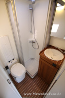 Rechts der Einstiegstür zum Wohnbereich ist der deckenhohe Kleiderschrank installiert. Direkt gegenüber befindet sich hinter dem Fahrersitz das in GfK-Sandwichbauweise gefertigte, geräumige Sanitärabteil. Es ist mit separater Dusche, Waschbecken und Kassetten-Toilette ausgestattet. Der Durchgang zum Fahrerhaus des Sprinter kann mittels einer Tür sicher verschlossen, was nicht nur bei Verschiffungen ausgesprochen praktisch ist. Links des Einstiegs hat der großzügig dimensionierte Küchenblock Platz gefunden. Er bietet Haushaltsarmaturen mit Einhebelmischer, Spüle und Zweiflamm-Kocher. Für die Kühlung von Getränken und Speisen sorgt ein 80 Liter fassender Kompressor-Kühlschrank. So gibts auch in der Wüste am Abend ein kühles Bier.