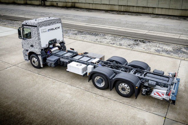 Die technische Ausgangsposition des Mercedes-Benz Urban eTruck bildet ein schwerer dreiachsiger Verteiler-Lkw von Mercedes-Benz. Darüber hinaus haben die Entwickler von Daimler Trucks das Antriebskonzept völlig neu erdacht: An die Stelle des konventionellen Antriebsstrangs tritt eine elektrisch angetriebene Hinterachse mit Elektromotoren unmittelbar neben den Radnaben. Die neue Achse wurde abgeleitet aus der