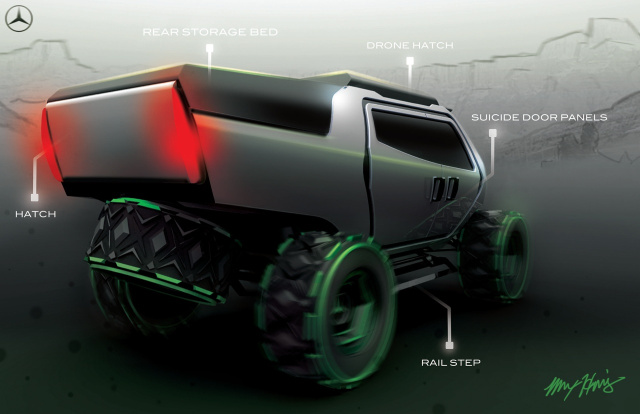Der Unimog Vision 2030 hat nach Willen des Erdenkers einen ganz bestimmten Zweck. Er soll den Rangern und Polizeikräften Afrikas helfen, Wilderern das Handwerk zu legen. Der für den Fahrt über Stock und Stein und quer durchs Buschwerk optimierte, 5,5 Meter lange und beschussfeste Allradler kann sechs Einsatzkräfte und zusätzlich noch Spürhunde transportieren. Er ist mit modernster Technologie wie Überwachungsdrohnen, GPS und Wäremebildkameratechnik ausgestattet. (Grafiken: Max Hines)