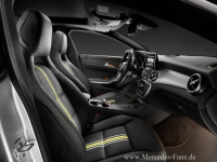 Um den sportlichen Charakter zu unterstreichen, besitzt der CLA vorne wie hinten Integralsitze. Die Fondsitzbank betont die äußeren Sitzplätze (2+1‑Sitzer). Abhängig von der Ausstattung sind farbige Kontrastziernähte erhältlich, ferner umfasst die Ambiente-Beleuchtung auf Wunsch auch einen Lichtleiter in der Öffnung zwischen Kopfstütze und Rückenlehne.