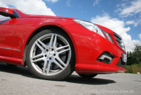 Das Feueropal-Rot des getesteten E500 Cabriolets in Verbindung mit kleinen Chrom-Akzenten wie der verchromten Kofferraumgriffleiste und dem kontrastierenden satten Silberglanz der 18-AMG-Felgen kam in der Redaktion hervorragend an. In dieser Form war das rote E-Klasse Cabrio ein echter Hingucker im Straßenverkehr. Zumal die scharfen Charakterlinien der E-Klasse und seine dynamische Front beim Cabrio wirklich fantastisch aussehen. Erst recht wenn das Dach auf Knopfdruck nach rund 20 Sekunden unter der Abdeckung verschwunden ist! Optisch sorgt ein AMG-Aerodynamik-Kit für eine Spur mehr Sportlichkeit und das schwarze Nappaleder-Interieur verströmt das Maß an Klasse, das sich Cabrio-Enthusiasten in dieser Kategorie fraglos wünschen. Ein bisschen Kreativität ist beim Stauen gefragt: rund 400 Liter stehen zur Verfügung.