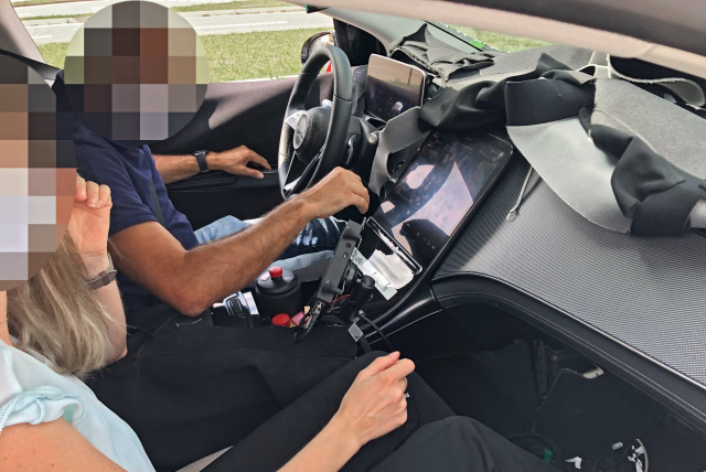 Erstmals ist dem Mercedes-Fans.de Erlkönigjäger auch ein Blick in den Innenraum gelungen, denn die Insassen hatten die Tarnung sehr offen nach oben geklappt, so dass ein großer Teil des Innenraum ungetarnt zu sehen ist. Die Bildschirme für Tacho und Infotainment kennt man bereits aus der neuen S-Klasse, allerdings verläuft das Armaturenbrett hinter dem Infotainment Bildschirm anders als in der BR 223. Das Lenkrad im EQS unterscheidet sich ebenfalls von der S-Klasse. (Bilder: S. Baldauf/SB-Medien)