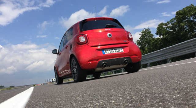 Wo der smart Brabus allerdings Abstriche machen muss, ist beim Sound und Klang des Motors. Auch aus einem 3-Zylinder muss – gerade wenn es ein Brabus ist – akustisch mehr kommen. Der Fahrer hört hier zwar den arbeitenden Turbolader, dennoch muss ein smart Brabus auch mal „rotzig“ klingen. Hier wäre ein Upgrade mit Soundmodul durchaus angebracht. Die 2 Endrohre, die sich ihren Weg aus einem schicken Heckdiffusor bahnen, sollten einfach mehr Lärm machen!