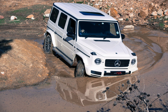 Während ihnen das gelang, brachten sie das automobile Urgestein natürlich auch technologisch weiter. Der neue G ist 53mm länger und 121mm breiter als sein Vorgänger, hat daduch noch mehr Präsenz als der Alte. Sowohl auf der Strasse als auch im Gelände wurde er weiter verbessert. Dieser G fährt nun eine gerade Linie auf Teer und in Kurven reagiert die Lenkung präzise. Alle drei 100%igen Differentialsperren und das Untersetzungsgetriebe gibt es nach wie vor und die Druckschalter sind klar im Cockpit zu erkennen. Die Wattiefe vergröβerte sich um 10cm und ist mit nun 70cm führend im Segment. Der Materialmix – Türen, Kotflügel und Haube sind Aluminium, Die Karosserie ist Stahl – sparte stolze 170kgs. Der neue G wird immer noch in Handarbeit in der Austrian Magna Steyr-Fabrik gebaut, wo Ende 2020 der 400 000. G fertiggestellt wurde.
