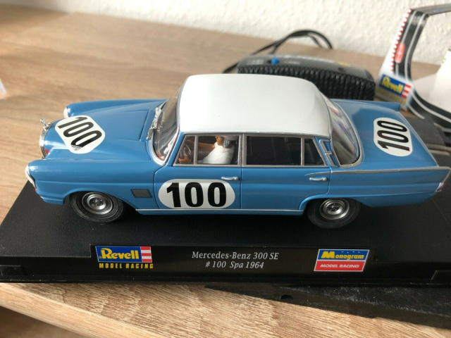 Übrigens, wer gern mal eine Heckflosse über die Piste fliegen lassen möchte, kann das im Maßstab 1:32 gern tun. Revell/Monogram bot um 2009/2010 einige Heckflossen an wie diesen 300 SE, der 1964 in Spa an den Start gegangen ist. Die Autos tauchen auf Ebay immer wieder mal auf - auch neu und noch original verpackt. Also MIB - mint in box wie der Sammler sagt. Genau das Richtige für die MIBs (Men in Benz) unter den Rennbahn-Freaks.