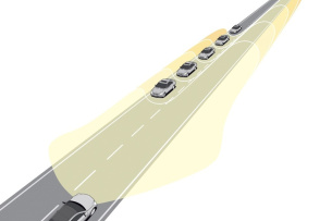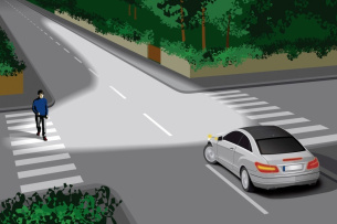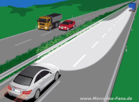 Dazu können dank der Infrarot-Kamera des Nachtsicht-Assistenten wie Wild in der Ferne oder Personen auf der Fahrbahn als Gefahr erkannt und wie mit einem Richtscheinwerfer über den ausgeleuchteten Fernlichtbereich hinaus kurz angestrahlt werden, so dass der Fahrer auf eine potenzielle Gefahr hingewiesen wird.
