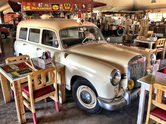 Ein absolutes Mekka für Petroliana-Fans nach dem Motto ‚In rust we trust‘. Eine coole Sammlung von alten Emaille-Schildern, Zapfsäulen, Öldosen, Gerätschaften und Oldtimern, drinnen und drauβen, mit mehr oder weniger Patina. Der ehemalige Wasserspeicher der Farm ist jetzt willkommener Pool.