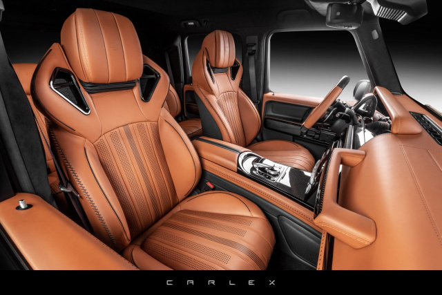 Man sieht es nicht nur auf den ersten Blick, sondern auf jeden weiteren auch: In dieser Mercedes-Benz G-Klasse ging es so richtig ans Feingemachte. Das Kult-SUV der neuesten Generation erhielt ein völlig neues und vor allem exklusives Interieur. Dabei wurde nichts ausgespart und wohl auch an nichts gespart. Der bestimmt nicht eben preiswerte Umbau wirkte sich auf die edlere Beschaffenheit der Bestuhlung, des Armaturenbretts, der Mittekonsole, den Türverkleidungen und des Lenkrads aus. Die Innenraumgestaltung dieses Mercedes G-Klasse hat Meisterstückqualität und vermag ihre Macher bei Carlex Design zu ehren und zu loben. Die karamellfarbenen Bezugsstoffe sind aus hochwertigstem Leder gefertigt und mit Nähten, Perforationen und Prägungen verziert.