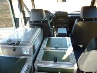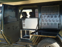 Die hintere Tür auf der Beifahrerseite wurde umgebaut. Sie öffnet jetzt in einem Winkel von bis zu 90 Grad. Was einen ganz praktischen - und absolut verständlichen - Grund hat. Denn so passt unter die dort befindliche Kühlbox auch noch ein Kasten Bier. Trotz der Unterbringung der "Flüssig-Nahrung", die man besonders in warmen Wüstenregionen gerne als Erinnerung an heimische Biergarten-Stunden gerne geniesst, konnte der hintere Sitz auf der Beifahrerseite erhalten bleiben.