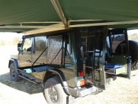 Seitlich sind Halterungen für die Traktions-Boards montiert, außerdem ein Klapptisch mit Grillhalter. Der Klapptisch bietet einen gewissen Komfort "outdoor" und dient gleichzeitig Stauraum für den großen Edelstahlgrill. Der benutzte und nicht immer ganz saubere Grill muss so nicht im Inneren des Fahrzeugs verstaut werden. Zusätzliche Zurrpunkte neben den Blinkern auf den vorderen Kotflügeln dienen dem sicheren Verzurren von mitgeführten Booten. Sämtliche Außenteile sind pulverbeschichtet.