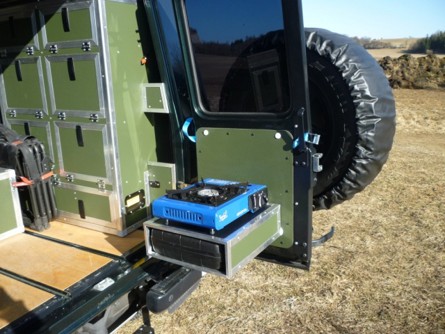Klar, dass man dann in trauter Zweisamkeit neben dem guten Gerstensaft auch etwas Anständiges zwischen die Zähne braucht. Zur Zubereitung leckerer Gerichte unterwegs findet sich an der rechten Hecktür eine entsprechende Kochgelegenheit. Mitsamt Box kann dort ein Gaskartuschen-Kocher verstaut werden, der bei Bedarf auf das abgeklappte Fach gestellt wird. Die Füße des Kochers werden dort fixiert, so wird ein Verrutschen beim Kochen verhindert. Über dem Kocher lässt sich eine 12 Volt Stablampe in eine entsprechende Halterung einklicken. So kann man auch im Dunkeln in den Topf - oder die Pfanne - gucken, wo was Leckeres brutzelt.