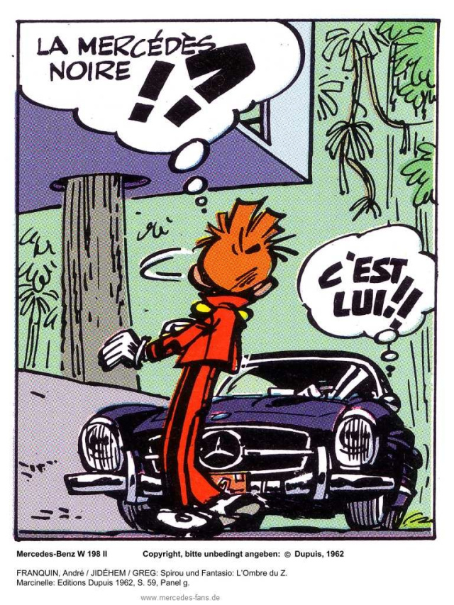 Wenn der Gegenspieler im schwarzen 300 SL naht, dann darf man überall stehen - nur nicht wie Spirou in der direkten Schusslinie.
