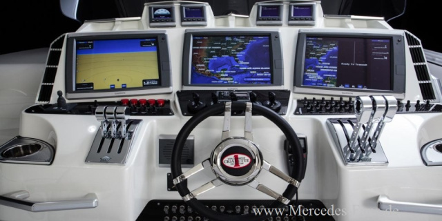 Vom Aussattungsniveau her entspricht die Motoryacht dem Stil des sportlichen Geländewagens von Mercedes AMG. Als Antriebskraft wirken in dem Mercedes G 63 AMG inspired Speedboot fünf Mercury Racing Verado Motoren mit je 350 PS. In km/h umgerechnet kann die 42 Huntress rund 125 km/h schnell über die Wellen jagen.