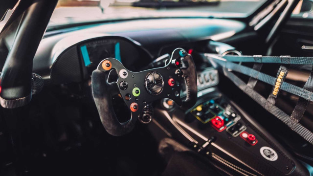 Im Interieur des AMG GT3 Edition 50 dominiert die funktionelle Rennwagen-Atmosphäre, die um hochwertige, exklusive Details ergänzt wird: Der Überrollkäfig sowie die sichtbare Bodengruppe sind in der Sonderfarbe „Real Black“ lackiert. Instrumententafel, Schweller, Türverkleidungen, Lüftungsrohr und Mittelkonsole sind in Carbon matt gestaltet. Effektvolle Kontraste bilden silberne Sechspunkt-Sicherheitsgurte und der Rennlenkradstern in Silber. Das Sammlerstück verfügt auch auf der Beifahrerseite über eine Sitzschale in einer hochfesten Carbon-Sicherheitszelle. Die Gurte tragen ebenfalls das markante, silbern eingerahmte Logo „50 YEARS OF DRIVING PERFORMANCE“. Weitere feine Details sind die AMG Logos in Türen und Schweller, sowie die Plakette „Edition 50 -1 of 5“ .
