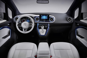 Das Cockpit präsentiert sich etwas überraschend nicht mit den beiden großen Flachbildschirmen, wie man diese von Daimler-Modellen auf der Frontantriebsplattform wie der Mercedes A- oder GLA-Klasse kennt. Stattdessen gibt es Schalter und Bedienelemente aus dem Hause Renault mit analogen Runduhren und einem zentralen Multifunktionsbildschirm, über den sich jedoch das MB-UX-System bedienen lässt. So gelangen auch Echtzeit-Verkehrsdaten und Updates ins Fahrzeug. Auf den Markt kommt die neue Mercedes T-Klasse als Zwilling der Gewerbeversion Anfang kommenden Jahres.