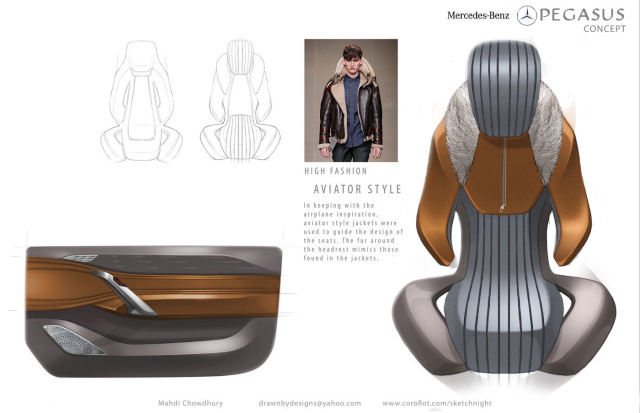 Bei seinem Entwurf des „Mercedes Pegasus Interieur Concept“ ließ sich der in Detroit, USA, lebende und schaffende Kreativdesogner Mahdi C vom Design eines Nurflüglers - das ist ein Flugzeug, das ohne gesondertes Höhenleitwerk und Seitenleitwerk auskommt - inspirieren. Stellt also das eigentümliche Styling dieser Fluggeräte den Bezug zum Namensgeber „Pegasus" für den visionären Entwurf her? Pegasus ist bekanntlich das geflügelte Pferd aus der griechischen Mythologie und seit jeher Sinnbild der Dichtkunst. Nun, ob das Mercedes-Pegasus Interior Concept ein Innenraum wie ein Gedicht ist, müsst Ihr selber entscheiden.