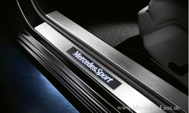 Edelstahl-Pedalerie, mit dem MercedesSport-Logo gekennzeichnete, weiß-beleuchtete Edelstahl-Einstiegsschienen sowie schwarze Velours-Fußmatten mit Einfassband und silberner Kontrastnaht, die ebenfalls das MercedesSport Logo tragen, sind weitere Blickfänge im Interieur.