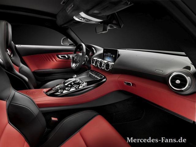 Dafür aber gibt es eine Sitzkiste, die wir auch entern dürfen. Den GT-Kunden erwartet ein sportlich geschnittenes Interieur. Optisch dominiert von einer Mittelkonsole, worauf in V-Form je vier Bedienknöpfe für verschiedene Modi und Pre-Sets angeordnet sind. Eine schöne visuelle Entsprechung der V8-.Antriebsquelle. Darüber vier mächtige, auf ihre Funktion stolze Ausströmer in Metalloptik und der Bildschirm. Jener ragte AMG-Boss Tobias Moers, der alle AMG auch selbst auf der Nordschleife testet, im Übrigen zuweit ins Sichtfeld hinein, woraufhin die Interieurdesigner durch eine 180°-Drehung der darunter liegenden Ausströmer-Einheit jenen Zentimeter finden konnten, der das Pad nach unten rücken ließ. Im Dach finden sich die Schalter für Radio, Navi usw.