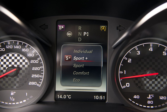Der AMG Dynamic Select Schalter gibt dem Piloten die Möglichkeit, aus den Programmen ECO, Comfort, Sport und Sport+ zu wählen. Und die Verwandlung des C 450 hat schon was Bemerkenswertes. Okay, „Comfort“ kann er. Abgehakt. Aber Freunde, „Sport+“ kann er auch. Und wie! Der von uns beim Mercedes-Benz E 400 Fahrbericht als gutmütig, kultiviert und sehr souverän umschriebene 3.0-l-V6 kriegt plötzlich einen leicht bösen Zug um die Bankwinkel. Da haben die Techniker über den Turboboost nicht nur 34 PS (soviel hatte einst ein Käfer 1200) mehr gefunden, sondern irgendwie auch noch ein feines Gift in die Brennräume verströmt. Der klappengesteuerte Auspuff lässt keinen Zweifel daran, dass nun die Sportschau läuft. Nicht mit dem gleichen Donnerhall wie beim C 63, aber akustisch dennoch durchaus eindrucksvoll. Die Kraftübertragung übernimmt eine jetzt in Gemütsstellung „humorlos-trocken“ kalibrierte 7G-TRONIC. Doch, doch, das sind beim Hochschalten schon recht knackige Anschlüsse. Und beim Runterschalten mit den Paddles sind die Schaltvorgänge ebenfalls sportlich-kurz. Untermalt von einem gewollten Fehlzündungsrülpsen.