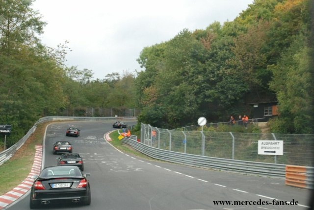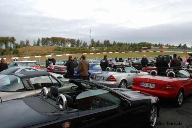 Kurz nach 10:00 Uhr wurden die Motoren gestartet und die Teilnehmer gingen hinter den beiden Organisatoren "Klaus" (Streckensicherung Nürburgring) und "Peter" (Pit Shop Motorsport) für zwei Runden auf die Nordschleife und den Grand-Prix-Kurs. Dank des gesitteten Verhaltens der Teams auf der Strecke und im Lager steht einer Fortführung der Serie im Jahr 2010 absolut nichts im Weg, die Zustimmung ist erteilt, es müssen nur noch die Termine abgesprochen werden. Vielleicht können wir ja auf diesem Weg in 2010 den größten rollenden und fahrenden SLK-Konvoi Deutschlands ins Leben rufen?