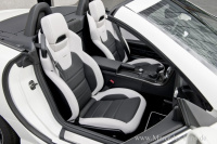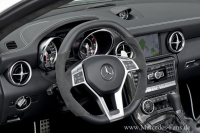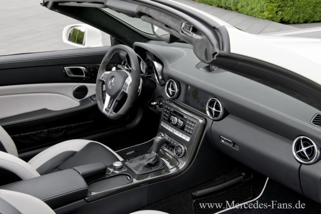 Der sportive und niveauvoll aufgewertete Innenraum des AMG Roadsters erinnert von der Anmutug an das Interieur des SLS AMG. Die Insassen lassen sich auf Sportsitze mit Kunstlederbezug nieder. Der Fahrer blickt auf vier Rundinstrumente. Das abgeflachte AMG-Lenkrad mit Schaltpaddels ist das gleiche, mit dem man auch im C63 AMG/CLS 63 AMG den Kurs bestimmt.