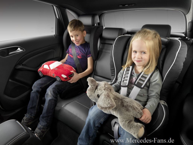 Die integrierten Kindersitze (IKS) sind ein fest im Fahrzeug installiertes System bestehend aus zwei Kindersitzen, die auf Tastendruck aus der Fondsitzbank herausklappen und zwei sichere Mitfahrgelegenheiten für Kinder von 2 Jahren bis 36 Kilogramm schaffen. Werden die Sitze nicht mehr benötigt, lassen sie sich einfach wegklappen; danach steht die Fondsitzbank wieder für Erwachsene zur Verfügung. Die integrierten Kindersitze sind auf Wunsch als Sonderausstattung für zahlreiche Baureihen verfügbar. Sinnvolle Ergänzungen aus dem Original-Zubehör von Mercedes-Benz sind zusätzliche Seitenkopfstützen (eine ist bereits serienmäßig beim IKS), die die Sicherheit bei einem Seitenaufprall erhöhen. Und da das Kind seinen Kopf seitlich abstützen kann, dienen sie zugleich dem Komfort. Mit dem separat erhältlichen Fangtisch (98,01 Euro*) lässt sich der IKS in ein sicheres Rückhaltesystem für Kinder im Alter von 2 Jahren bis zu einem Körpergewicht von 18 kg (bis ca. vier Jahre) erweitern. Er wird mit dem Dreipunkt-Gurt des Fahrzeugs befestigt und trägt dazu bei, durch die großflächige Abstützung des Bauchbereichs das kleine Kind anatomiegerecht zu schützen.
