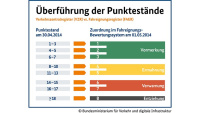 Die bisherige Höchstgrenze von 18 Punkten schrumpft auf überschaubare acht Punkte. Allerdings ist mit Erreichen dieser Höchstgrenze dann auch der Führerschein weg. Umrechnungsbeispiele: Aus bis zu drei Punkten wird ein Eintrag, vier bis fünf Punkte reduzieren sich auf zwei.