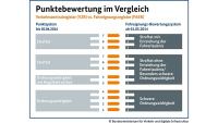 Nach nur noch drei Punktekategorien: Für Ordnungswidrigkeiten gibt es einen Punkt, bei Straftaten und groben Ordnungswidrigkeiten mit Fahrverbot drohen zwei Punkte. Drei Punkte werden erteilt, wenn der Straftat die Entziehung der Fahrerlaubnis folgt.