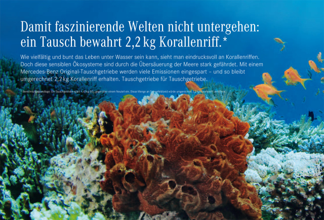 Am Beispiel der Korallenriffe, stark gefährdet durch die Übersäuerung der Meere, kann anhand von Zahlen (be)greifbar gemacht werden, wie positiv sich die Auswirkungen von Mercedes-Benz Original-Tauschteilen gegenüber einem Neuteil niederschlagen. Durch die Verwendung eines Mercedes-Benz Original-Tauschgetriebes bleiben umgerechnet 2,2 Kilogramm eines Korallenriffs erhalten. Mit einem Tauschgetriebe werden 1,41 kg Schwefeldioxid gegenüber einem Neuteil eingespart und eben diese Menge an Schwefeldioxid würde 2,2 kg Korallenriff zerstören.