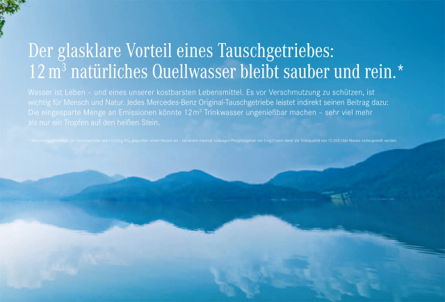 Jeder Produktionsprozess belastet die Umwelt. Es liegt an der Art wie wir konsumieren, wie stark das der Fall ist. Der Einsatz von Mercedes-Benz Original-Tauschteilen hilft, diese Belastung zu reduzieren. Mit jedem Tausch bleibt die Welt ein bisschen grüner – und die Geldbörse freut sich.