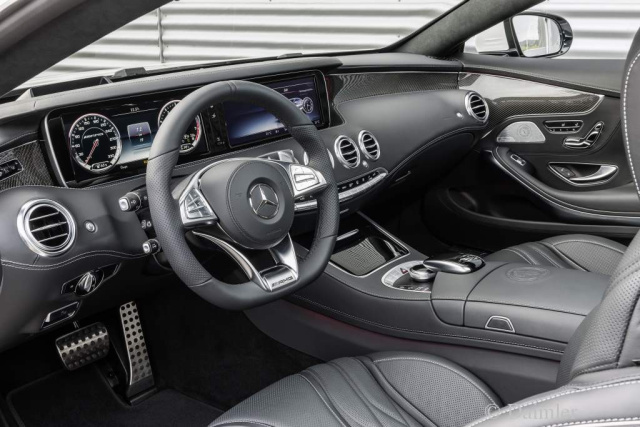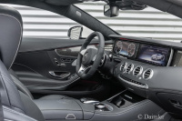 Beim Öffnen der Tür fasziniert das luxuriöse Interieur des S 63 AMG Coupé: Die Instrumententafel geht im Wrap-Around-Design fast nahtlos in die Türen über. Hochwertige Materialauswahl und perfekte Verarbeitungsqualität vereinen sich mit einer sportlich-exklusiven Designsprache. Die neu entwickelten AMG Sportsitze mit elektrischer Verstellung, Memoryfunktion sowie Sitzheizung bieten Fahrer und Beifahrer optimalen Seitenhalt. Feines Leder Nappa im AMG V8-Design mit Paspeln und AMG Plaketten in allen vier Sitzlehnen sowie das geprägte AMG Wappen auf der Armauflage der vorderen
